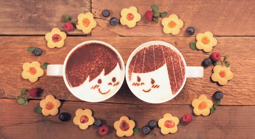Cada taza de café se ha hecho con un diseño diferente, me refiero a que se han utilizado muchas plantillas para dar vida a los protagonistas de la historia. Junto a esto se ha elegido una canción muy bonita que transmite perfectamente el mensaje “Latte warms the world”.